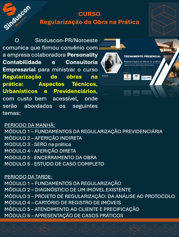 O SECONCI é um braço social do SINDUSCON, criado para propiciar qualidade de vida, saúde e segurança ao trabalhador, sempre de modo preventivo. Clique e saiba mais.